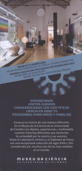 Museu da Ciência Universidade de Coimbra exposiciones visitas guiadas conversaciones con científicos ciencia en directo programas para niños y familias Micheletti Award 2008 mejor museo europeo de la ciencia, técnica e industria Premios Asociación portuguesa de museología 2010 mejor área de educación mejor aplicación y gestión multimedia