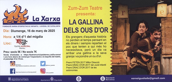 Zum-Zum Teatre presenta: la gallina dels ous d'or La Xarxa Fundació Xarxa d'espectacle infantil i juvenil de Catalunya Dia: Diumenge, 16 de març de 2025 Hora: a 1/4 d'1 del migdia Lloc: Teatre Municipal Ateneu