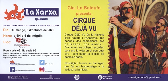 Cia. La Baldufa presenta: cirque déjà vu La Xarxa Igualada Fundació Xarxa d'espectacle infantil i juvenil de Catalunya Dia: Diumenge, 5 d'octubre de 2025 Hora: a 1/4 d'1 del migdia Lloc: Teatre Municipal Ateneu