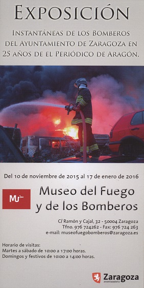 Exposición Instantaneas de los bomberos del ayuntamiento de Zaragoza en 25 años de El Periódico de Aragón. Del 10 de noviembre de 2015 al 17 de enero de 2016 Museo del Fuego y de los Bomberos C/ Ramón y Cajal, 32 50004 Zaragoza Zaragoza Ayuntamiento