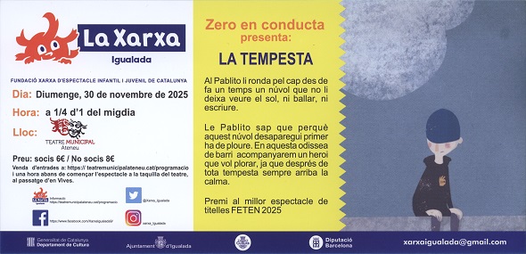Zero en conducta presenta: la tempesta Premi al millor espectacle de titelles FETEN 2025 La Xarxa Igualada Fundació Xarxa d'espectacle infantil i juvenil de Catalunya Diumenge, 30 de novembre de 2025